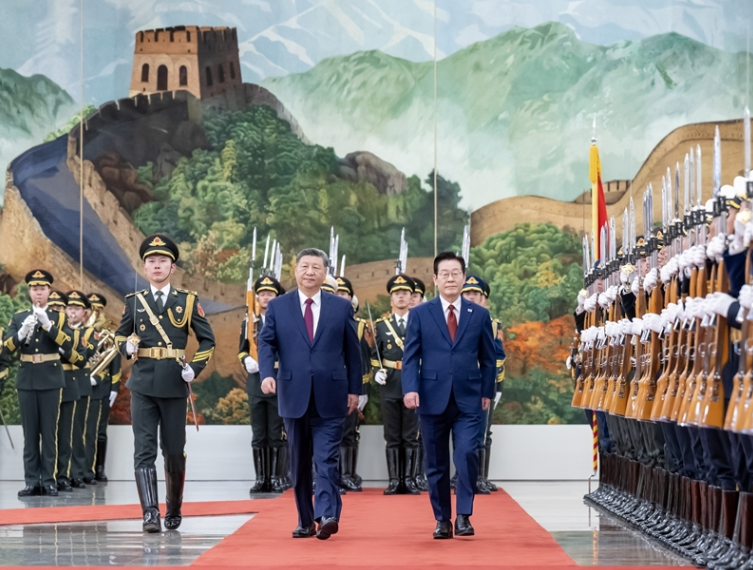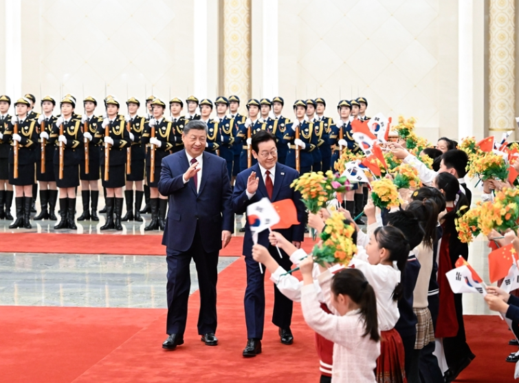 1月5日下午,国家主席习近平在北京人民大会堂同来华进行国事访问的韩国总统李在明举行会谈。这是会谈前,习近平在人民大会堂北大厅为李在明举行欢迎仪式。新华社记者 申宏 摄