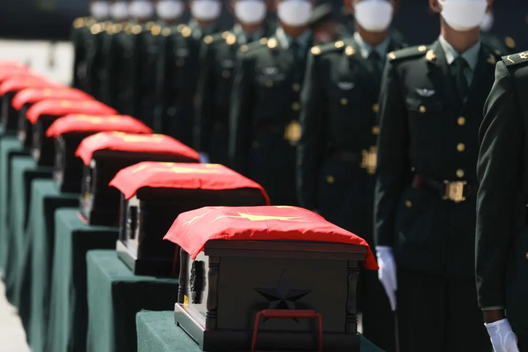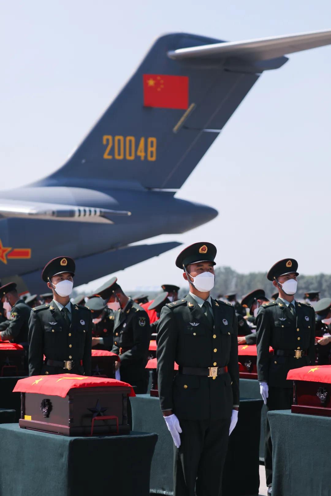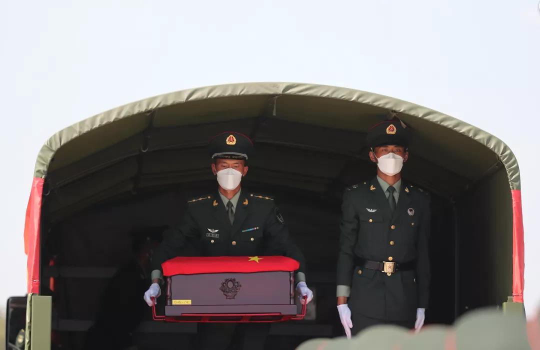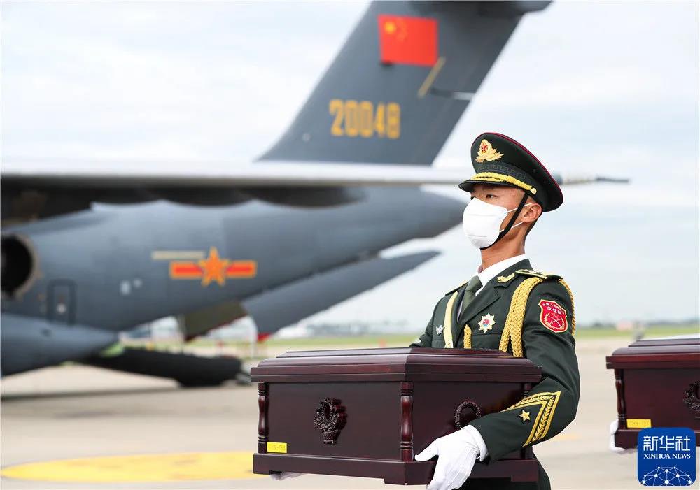 9时,中韩双方在韩国仁川国际机场举行志愿军烈士遗骸交接仪式。11时26分,空军专机平稳降落在辽宁沈阳桃仙国际机场。专机进入中国领空后,空军两架战斗机护航,向志愿军烈士致以崇高敬意,沈阳桃仙国际机场以“过水门”最高礼遇迎接志愿军烈士回家。
