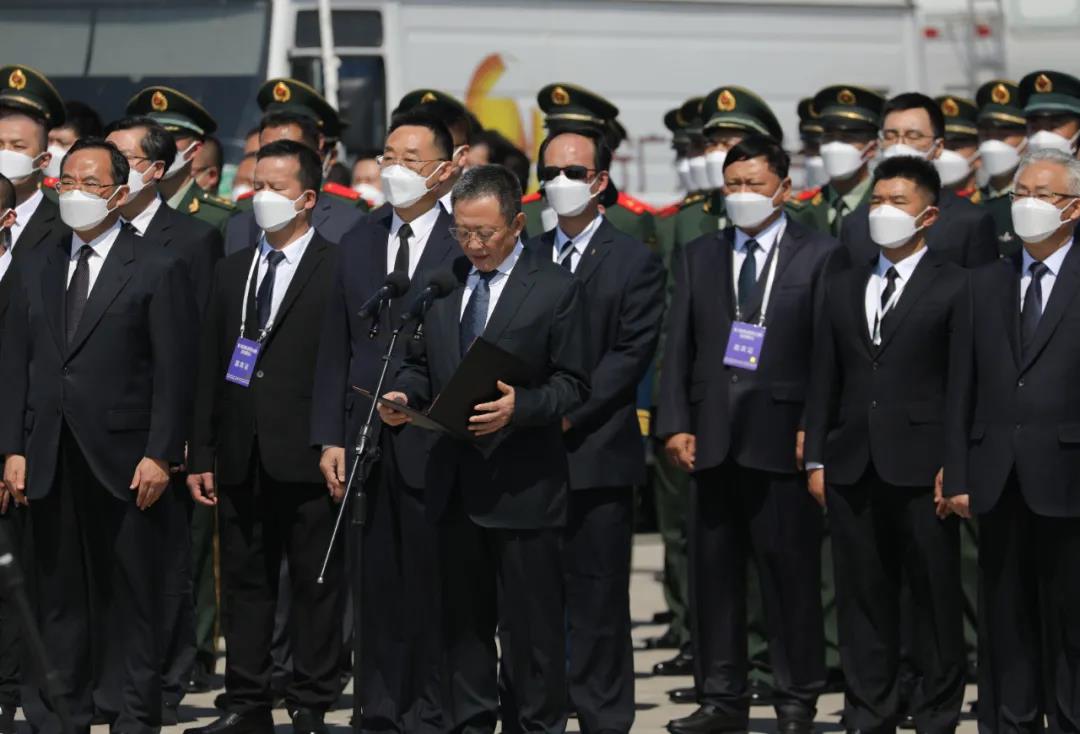 12时37分,志愿军烈士遗骸迎回仪式在沈阳桃仙国际机场举行。退役军人事务部部长孙绍骋主持。曹舒昊 摄