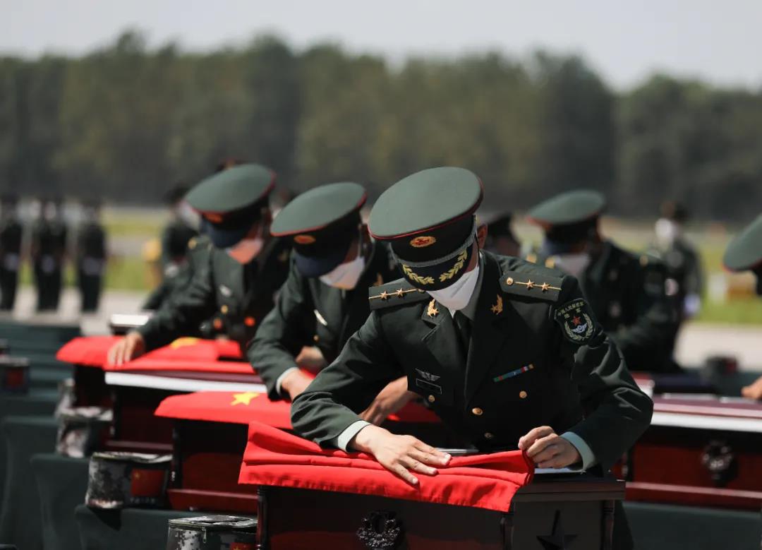 仪式现场气氛庄重,志愿军烈士遗骸的棺椁覆盖着鲜红的中华人民共和国国旗,到场迎接的解放军官兵军容威严、持枪伫立,现场全体人员向烈士遗骸三鞠躬。
